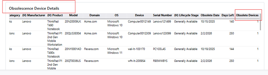 The following figure shows an example table on the destination report. The table contains related fields which help users to see detailed obsolescence and obsolete devices information.